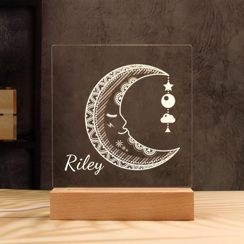 Our night lights can be full customised with any name or text etched into your plaque which will create a unique bedside companion for years to come! You can rest assured that you will receive a high-quality product including your personalised acrylic plaque and wood base but keep in mind that this is not a toy and is for decoration only.
