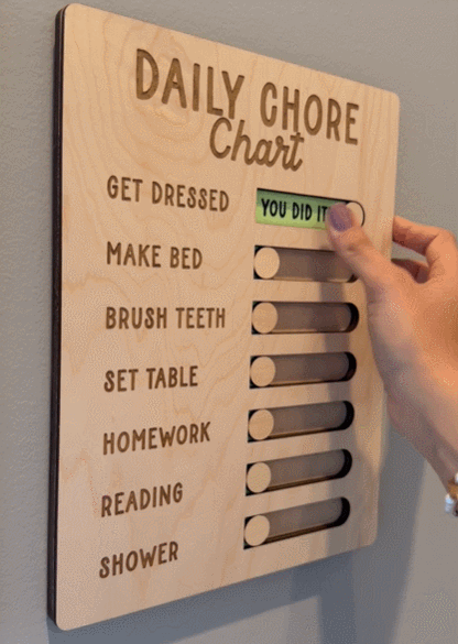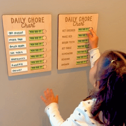 Wooden Personalized Daily Chore Chart for kids and grown-ups. You can select from the two practical designs: One fully engraved or with erasable acrylic blank spaces for you to change the chores to your convenience.
